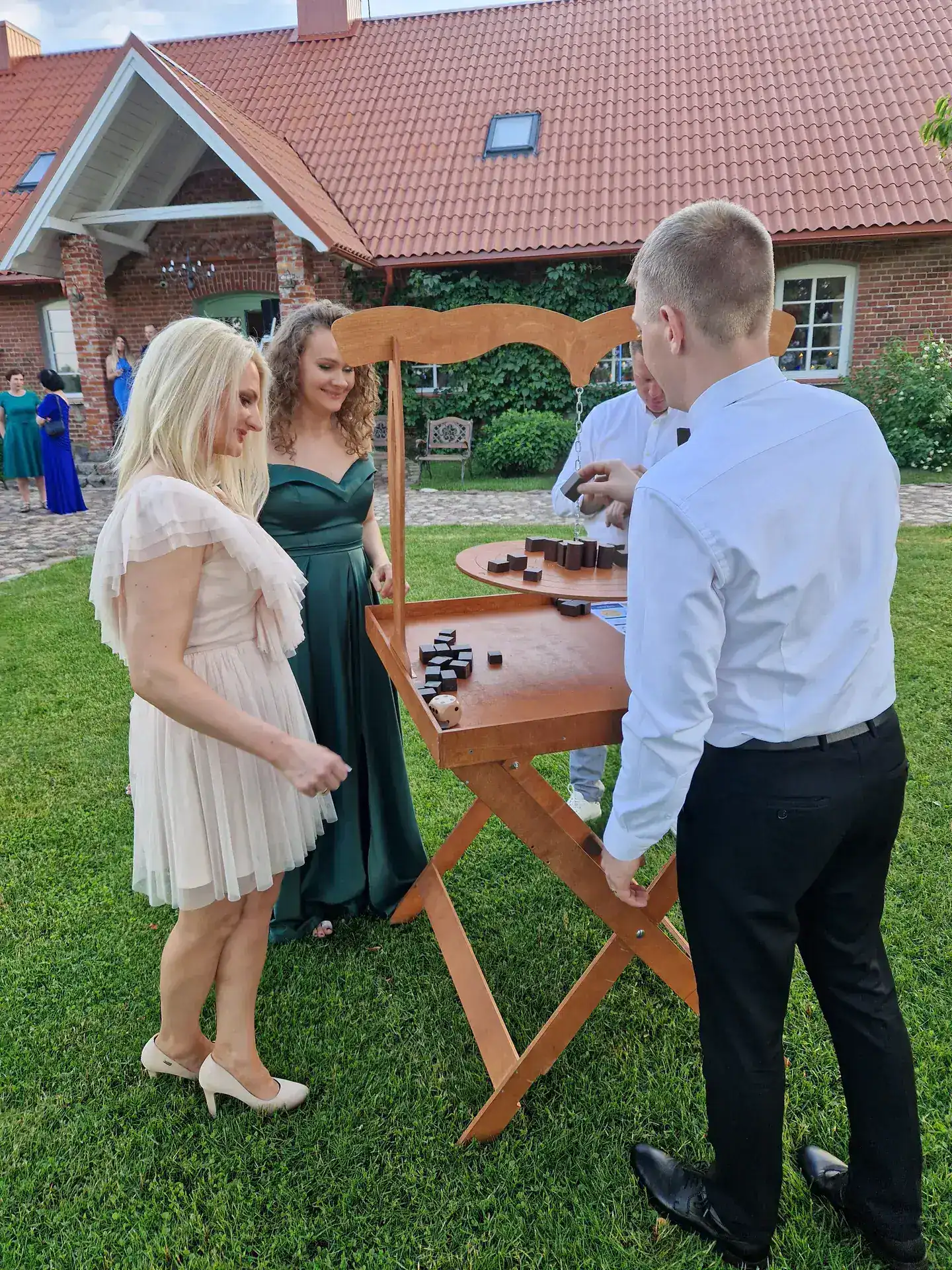Žaidimai per vestuves buvo tikras hitas! 🤩 Jie sukūrė smagią ir jaukią atmosferą bei įtraukė visus svečius. Visi žaidimai buvo gerai apgalvoti, juose galėjo dalyvauti įvairaus amžiaus žmonės. Ypač patiko komandų žaidimai, kurie skatino bendravimą ir bendradarbiavimą tarp svečių, todėl niekas nenuobodžiavo. 😎 Šie žaidimai tikrai padėjo praleisti laiką linksmai ir prasmingai, ir prisidėjo prie puikios šventės nuotaikos. Rekomenduočiau juos visiems norintiems pagyvinti savo vestuvių šventę.