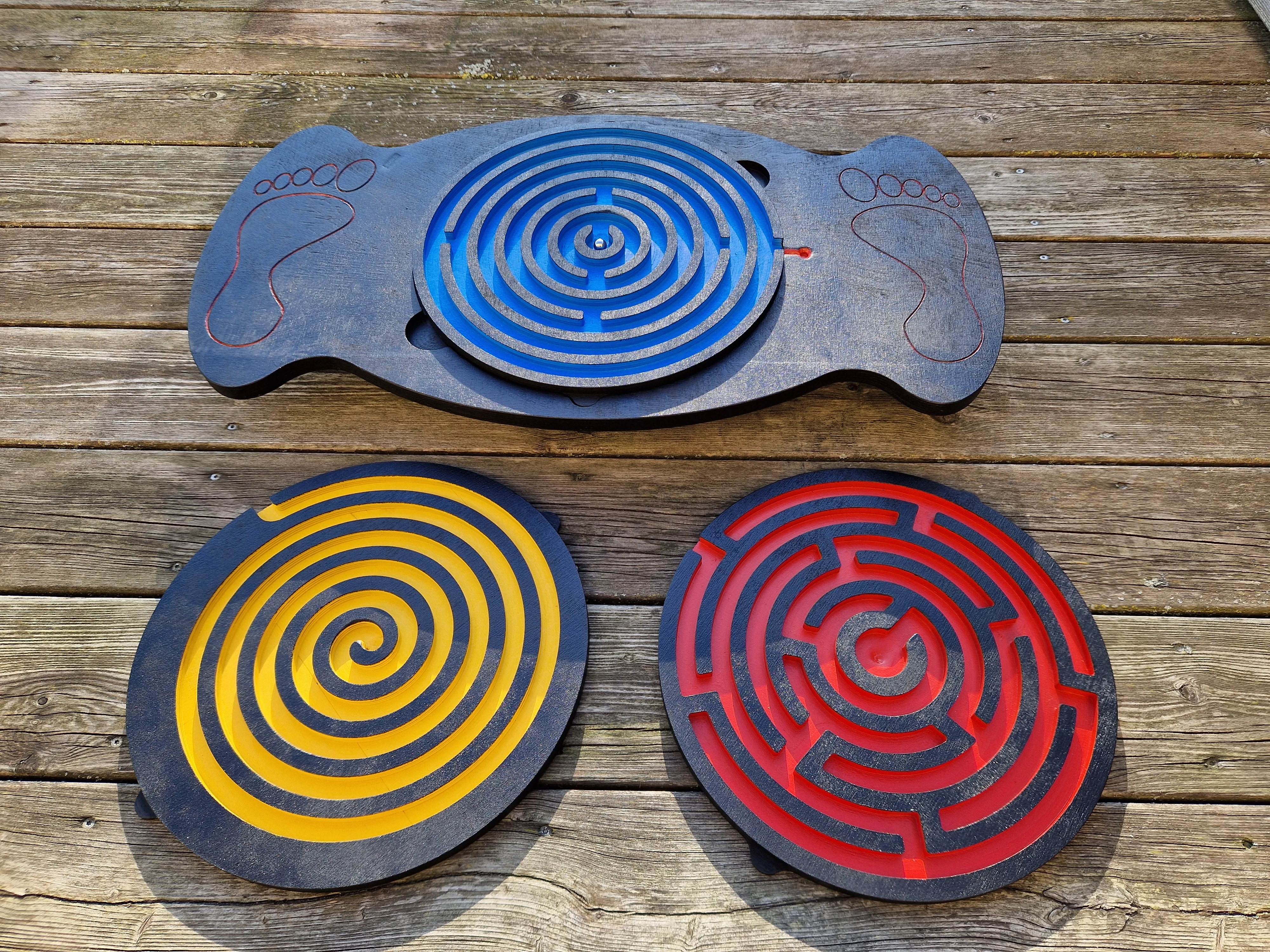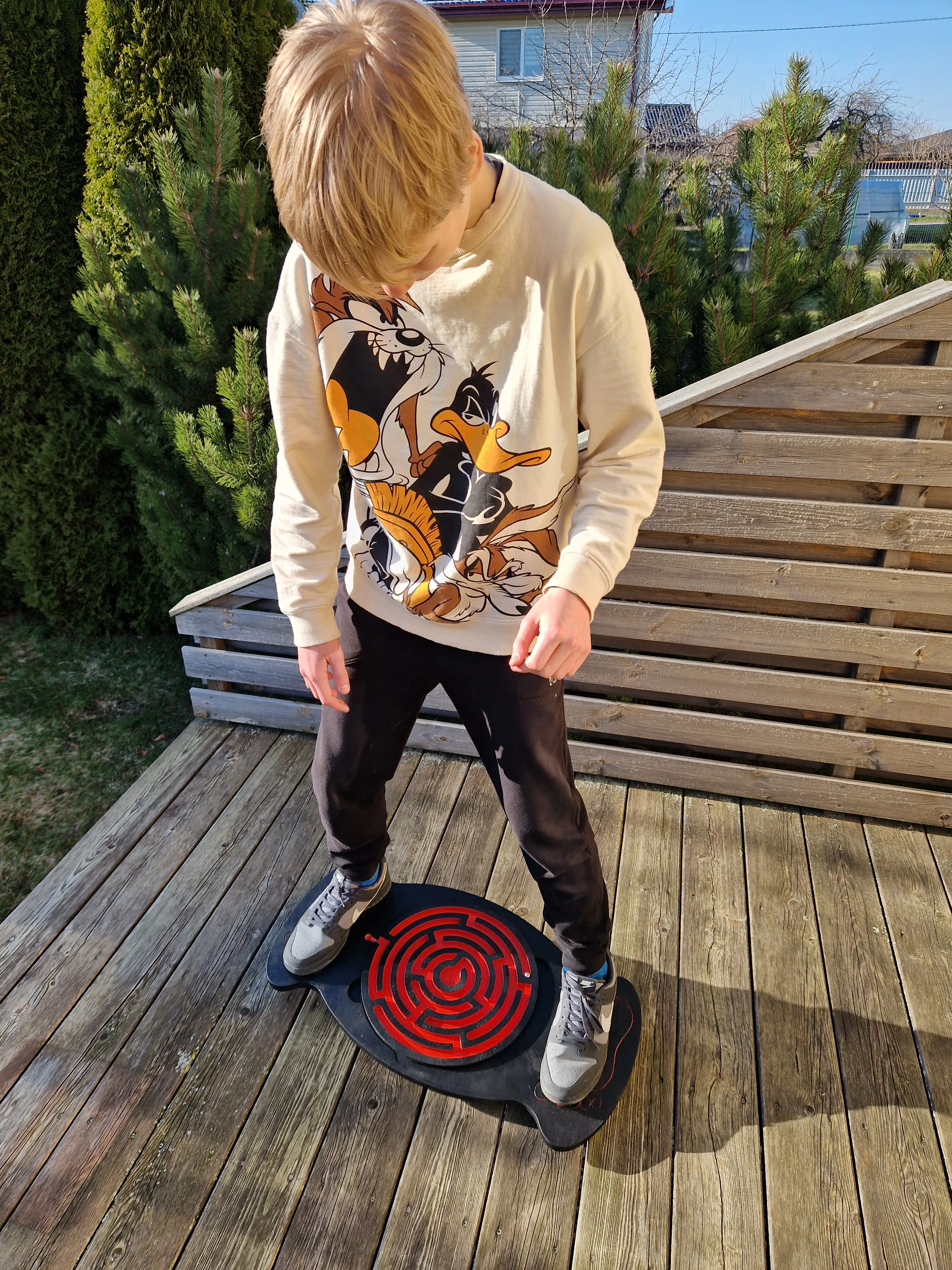 Reikalingos priemonės: balansinė lenta, labirintai ir kamuoliukas.