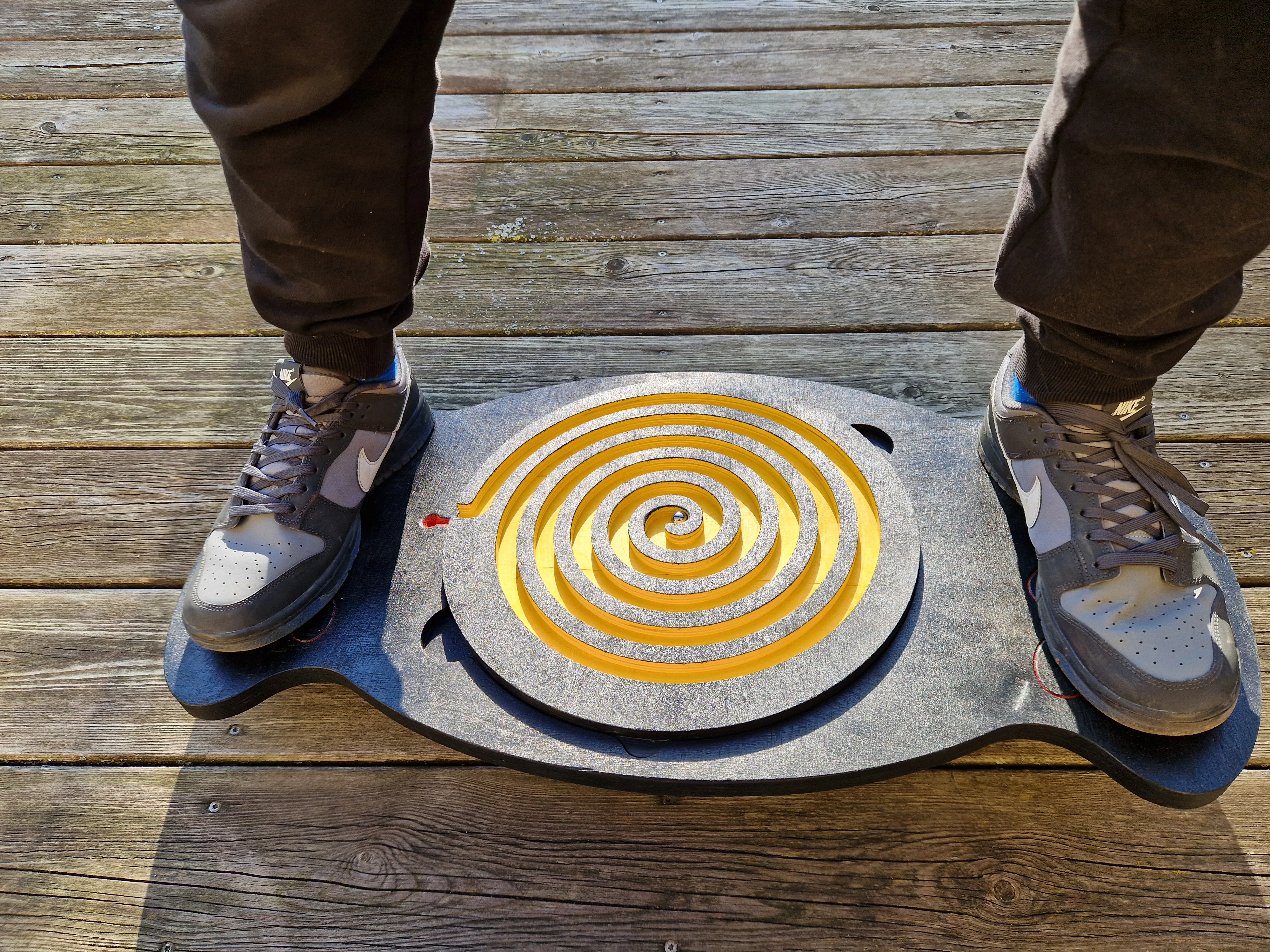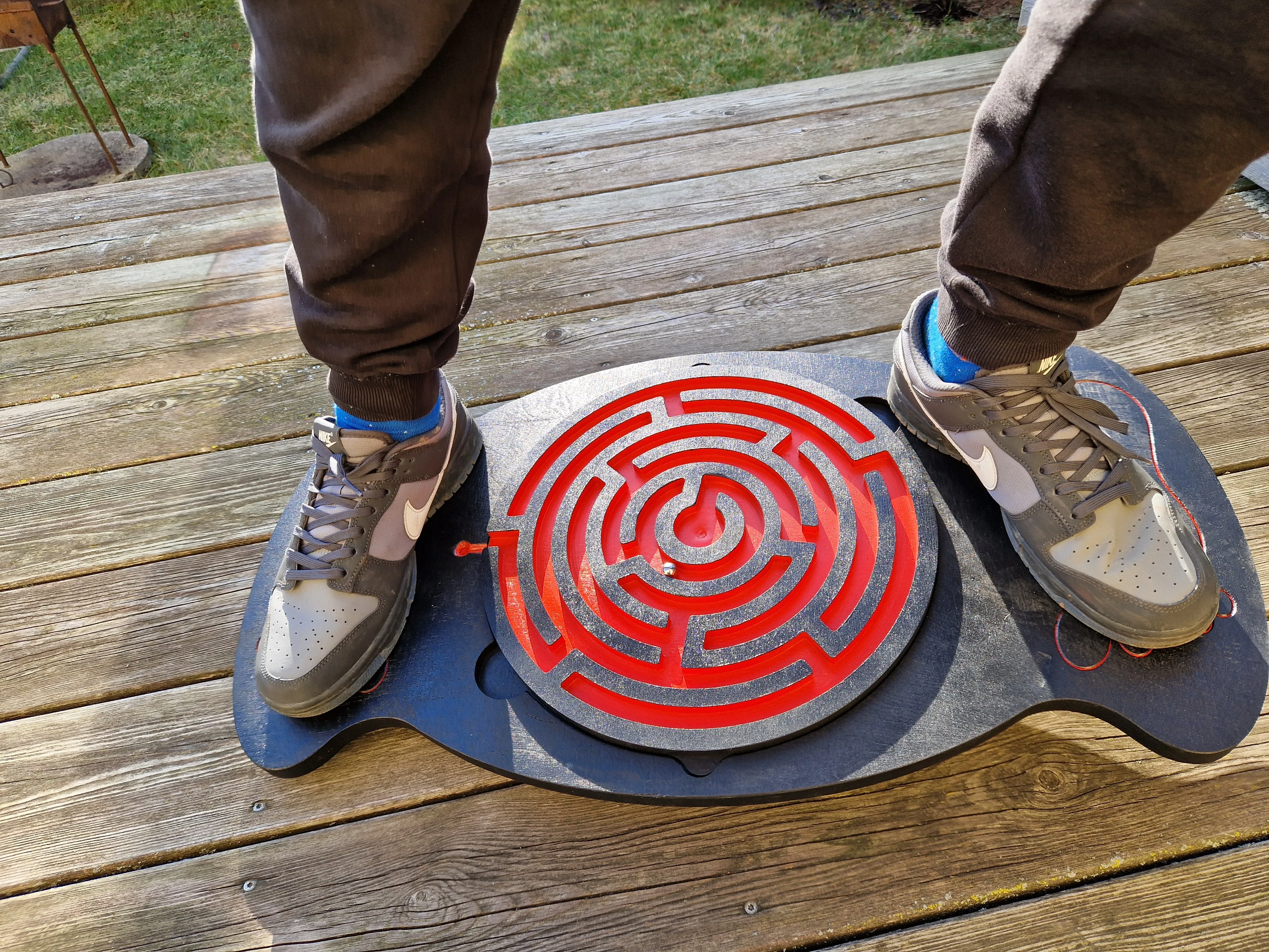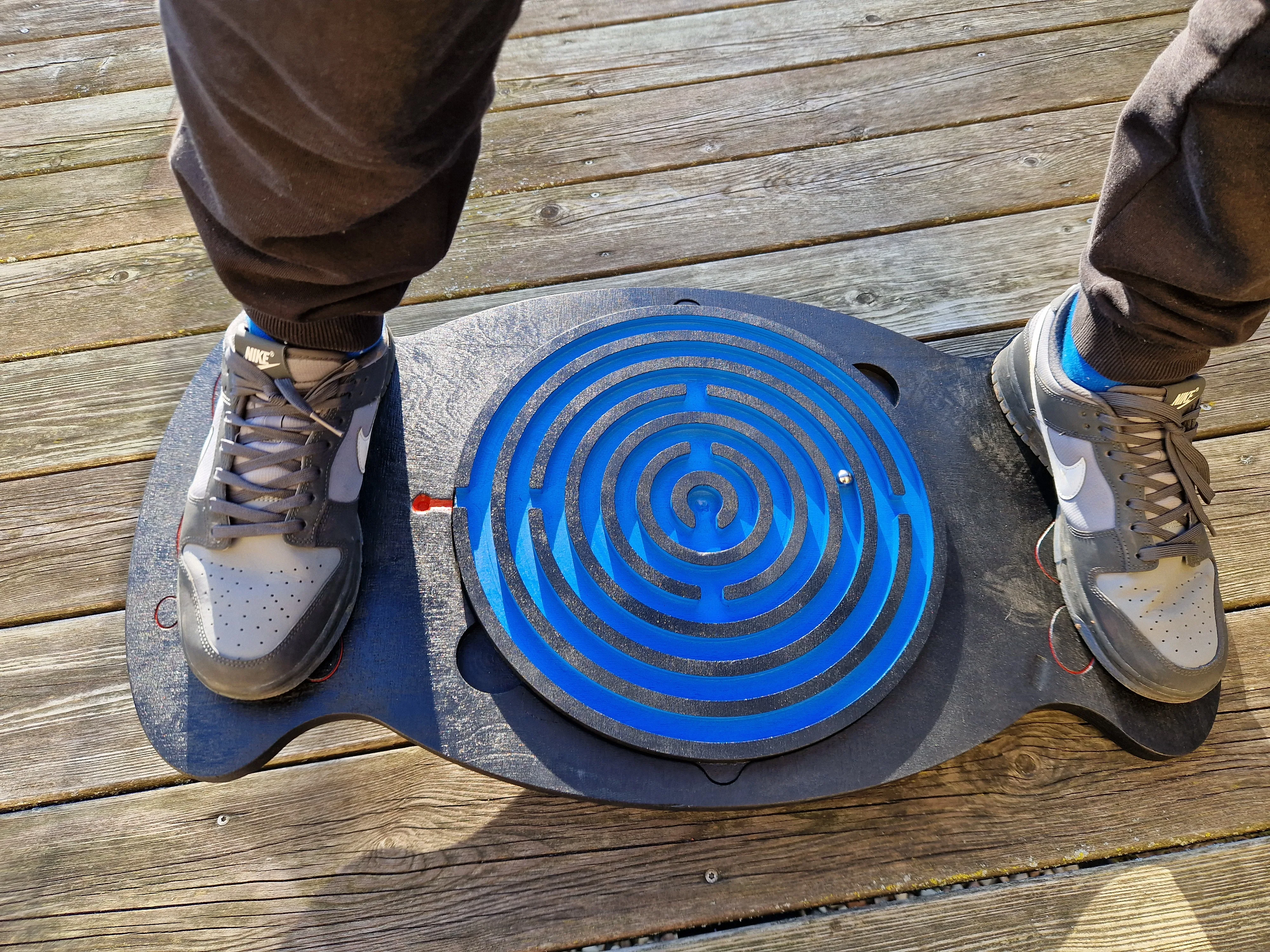Žaidimo eiga: Atsistoti abiejomis pėdomis ant lentos ir stengtis išlaikyti pusiausvyrą, tuo pačiu kuo greičiau kamuoliuką iš vidurio nuridenti iki raudonos išėjimo ribos (arba atvirkščiai).
