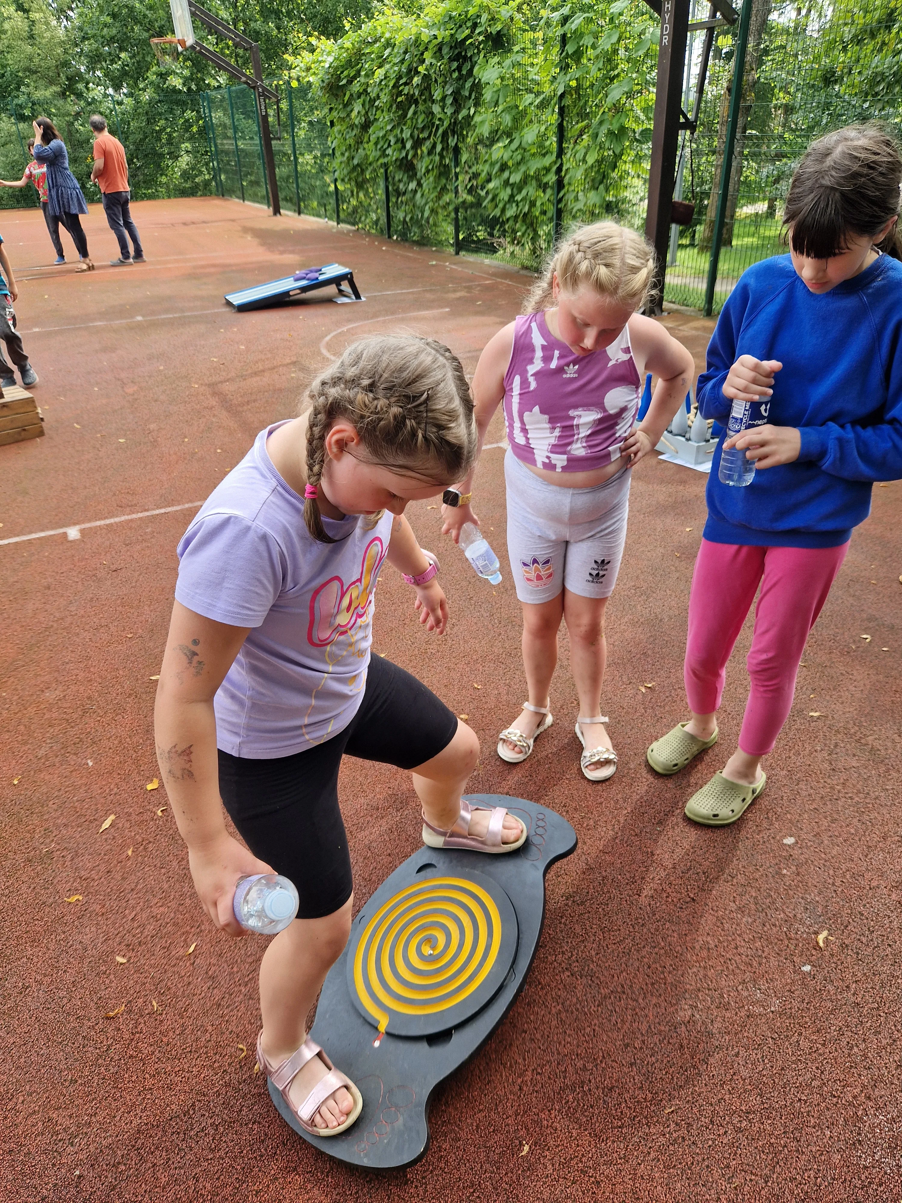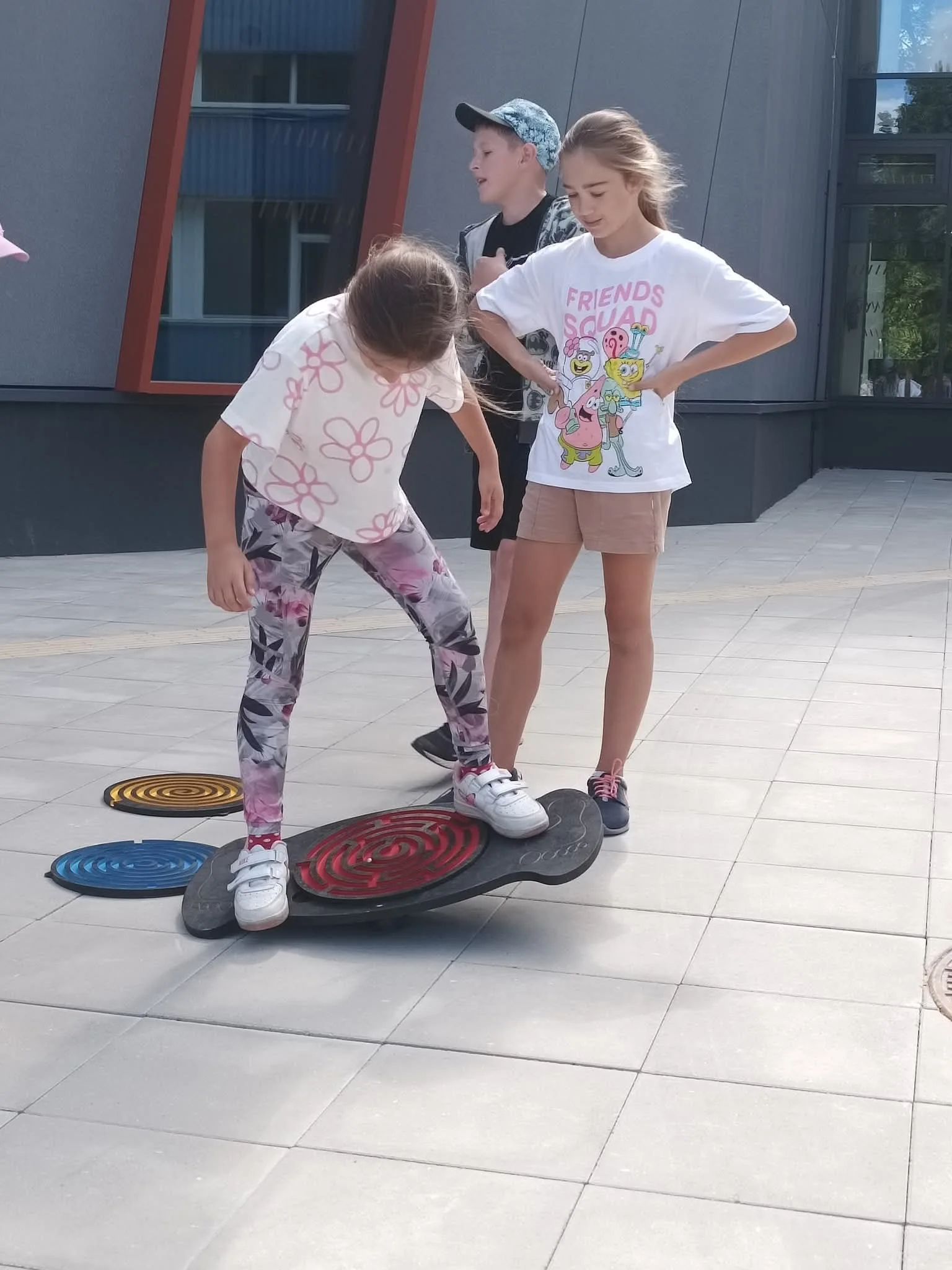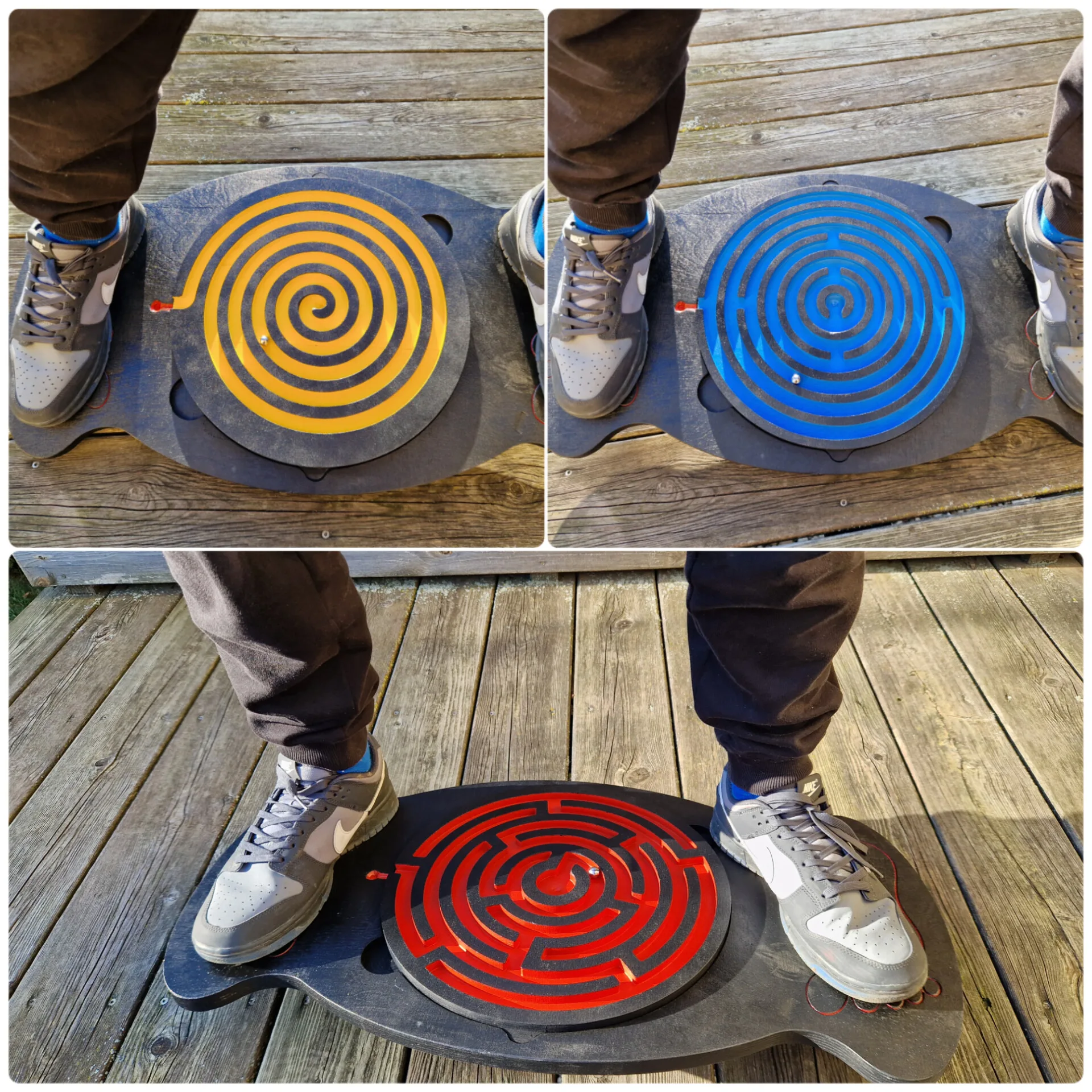 Žaidimo eiga: Atsistoti abiejomis pėdomis ant lentos ir stengtis išlaikyti pusiausvyrą, tuo pačiu kuo greičiau kamuoliuką iš vidurio nuridenti iki raudonos išėjimo ribos (arba atvirkščiai).