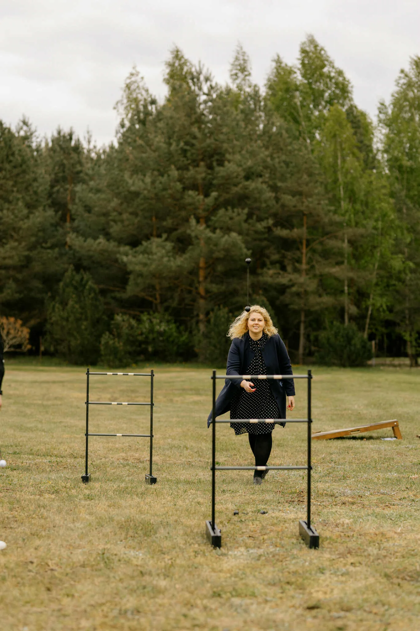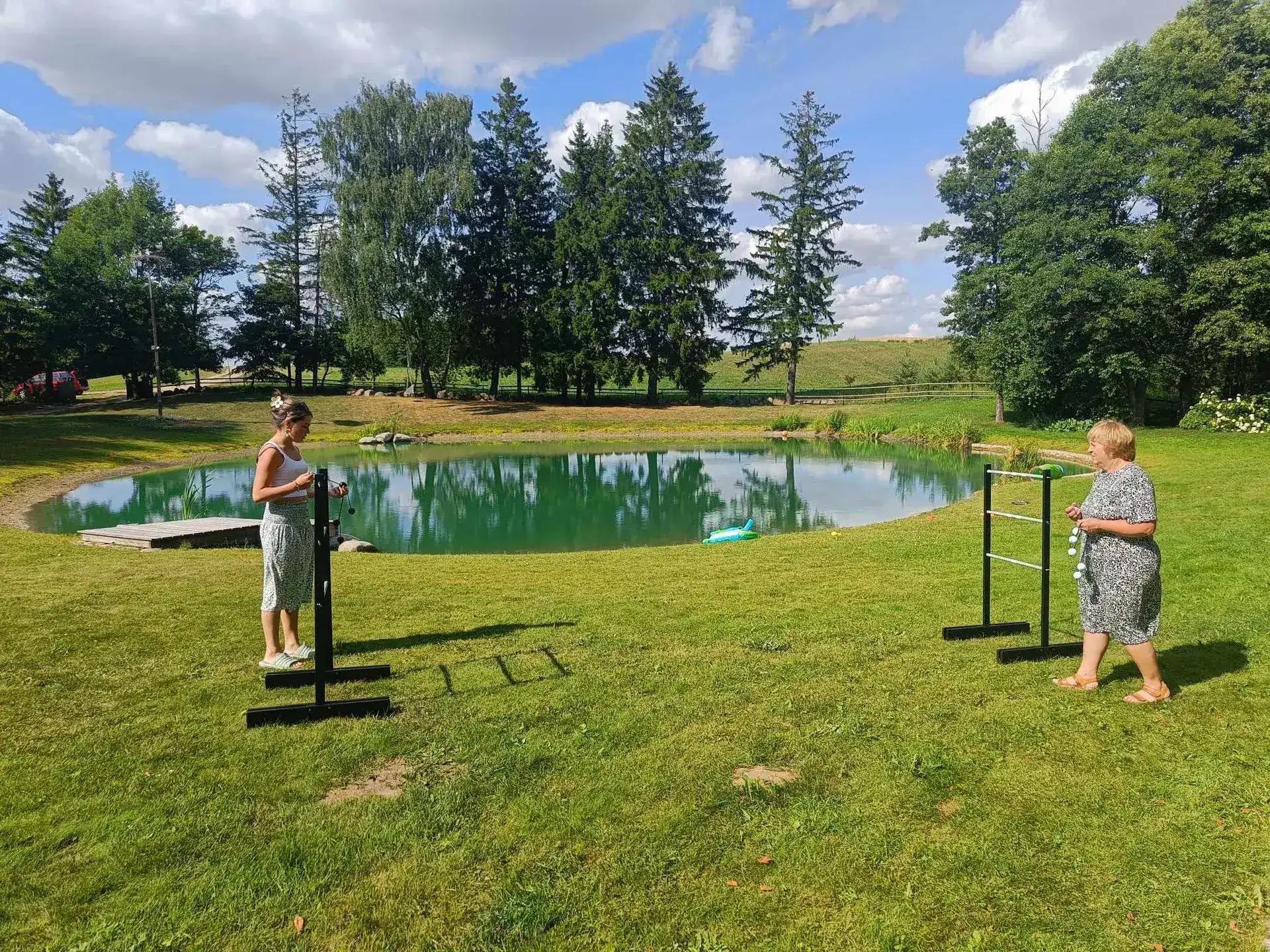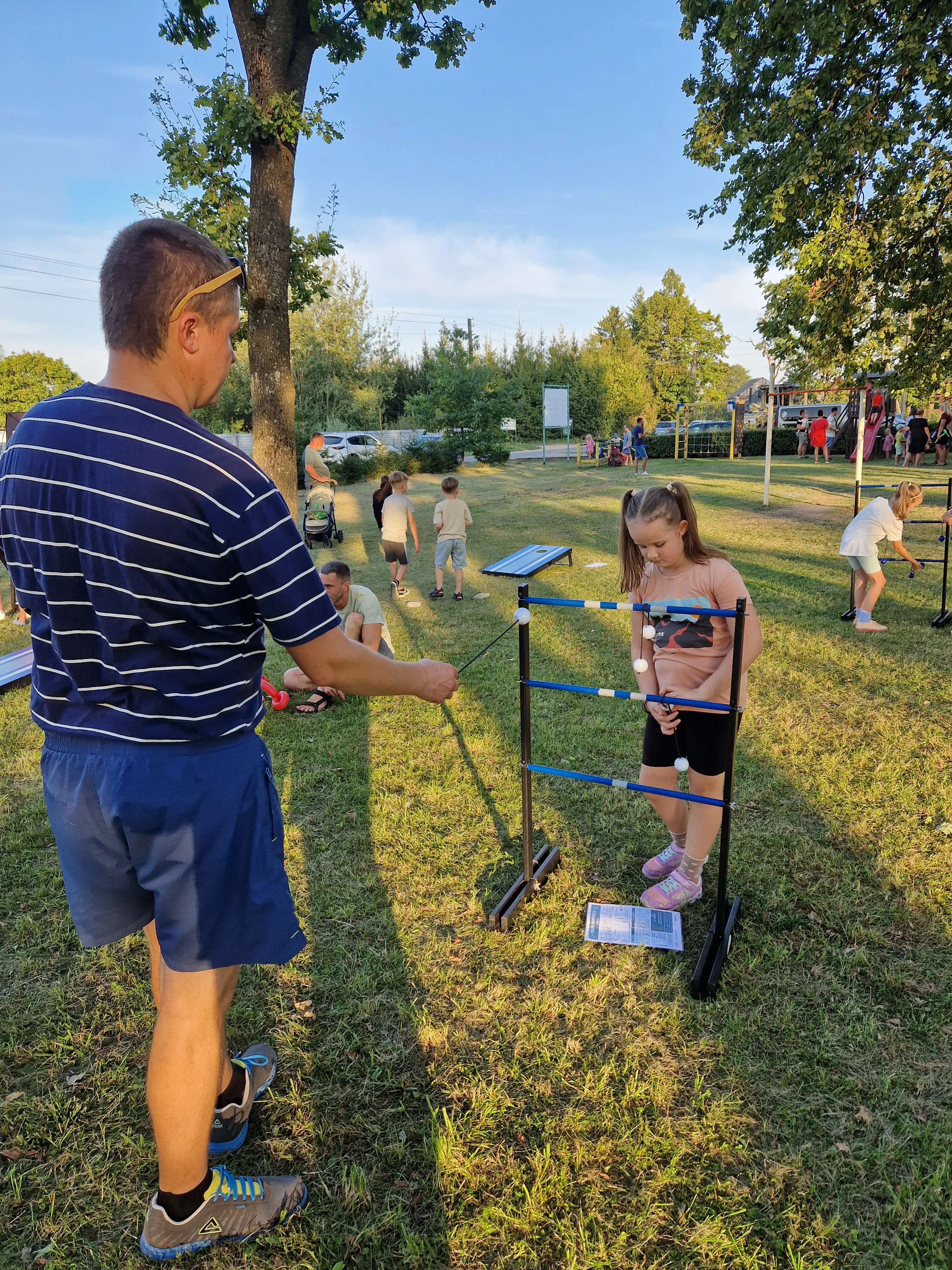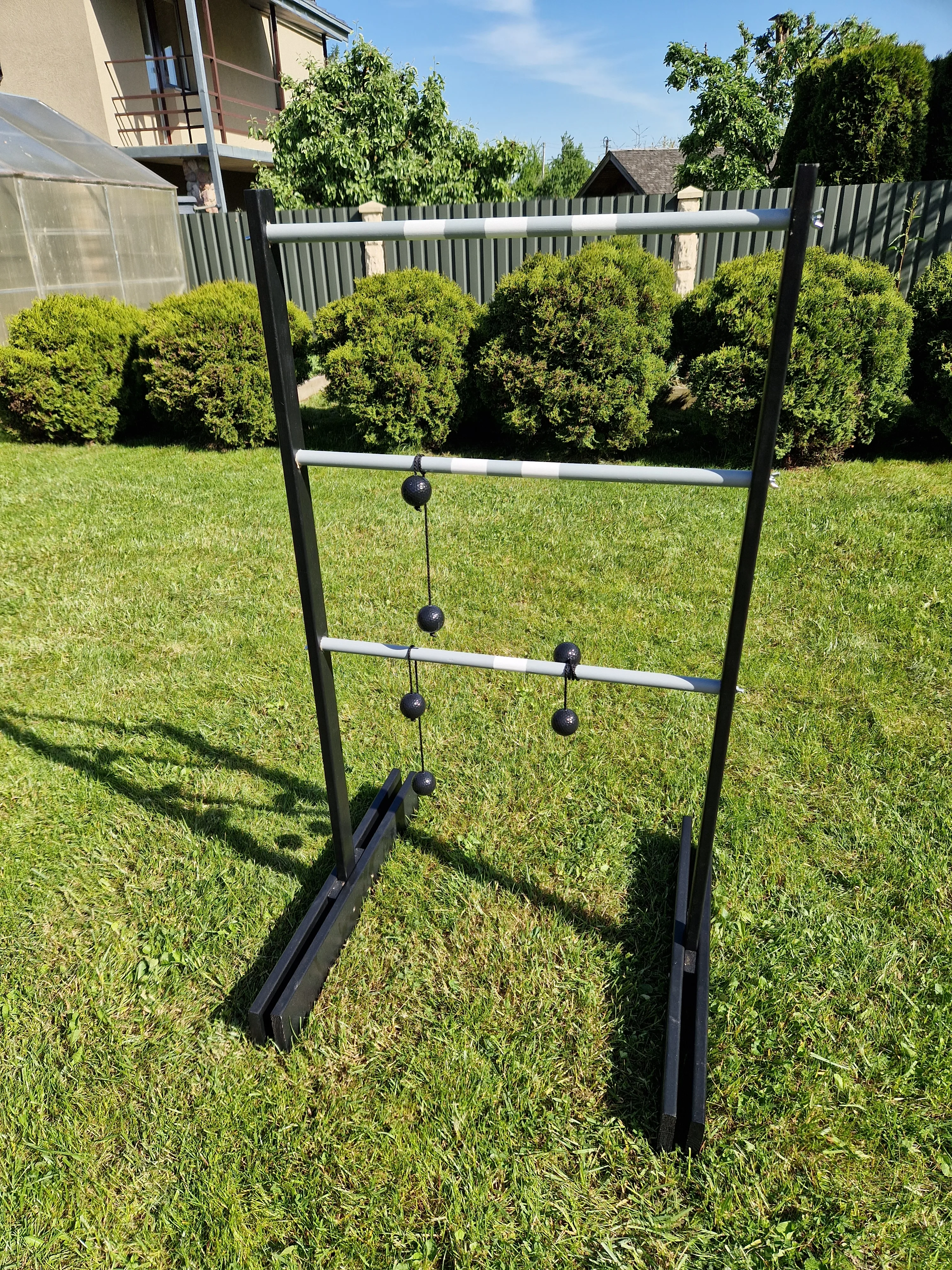 Žaidimo eiga: Iš viso vienas žaidėjas gauna tris švytuokles, kurias turi užmesti ant kopėtėlių.