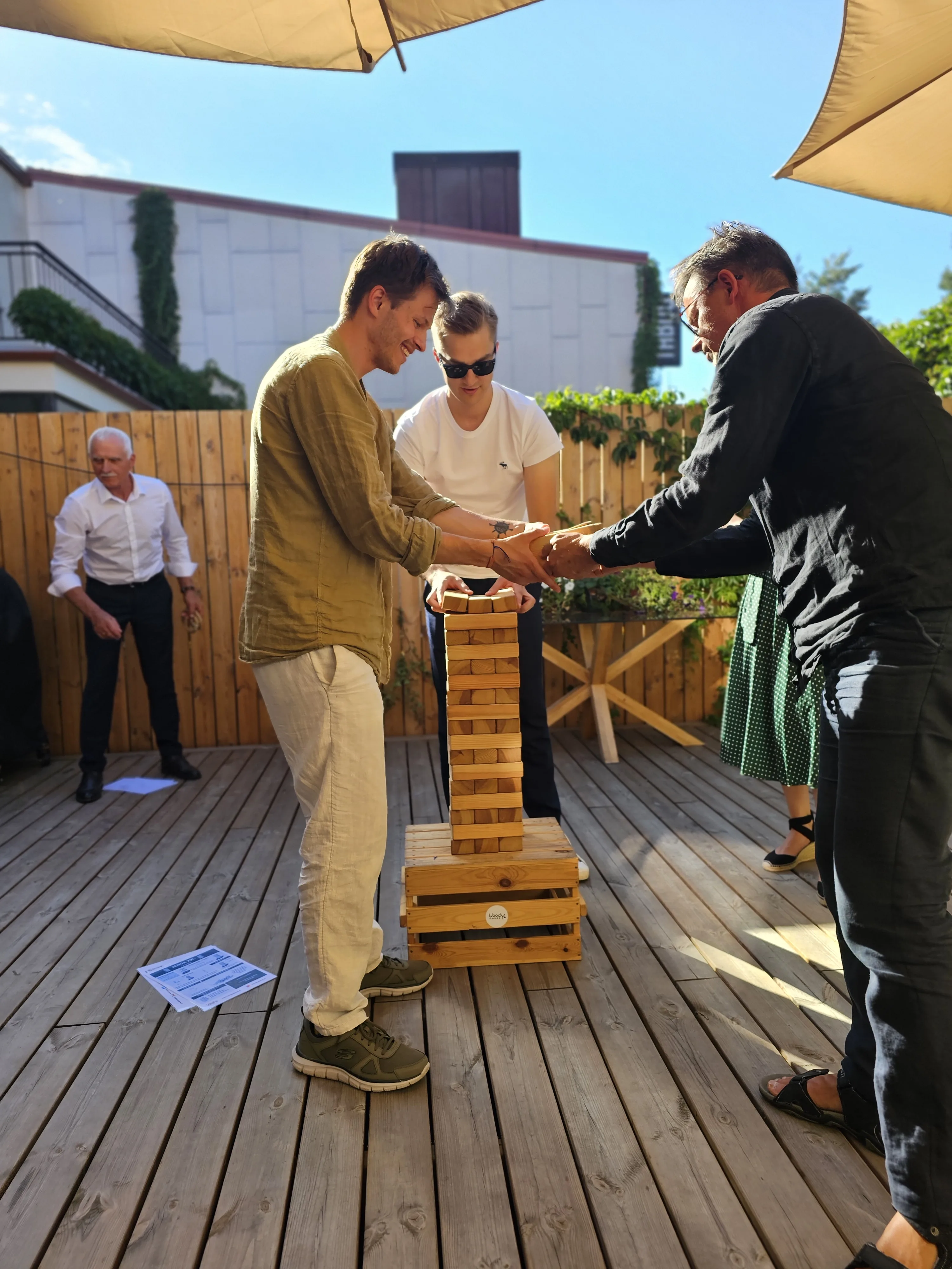 Žaidimo eiga: Kiekvienas žaidėjas paeiliui naudodamasis viena ranka traukia po vieną kaladėlę ir ją turi uždėti ant bokšto viršaus taip, kad jis nenugriūtų. Viršuje visada turi likti trys pilnos eilės, tad traukti galima nuo ketvirtos eilės. Pralaimi tas žaidėjas, kuriam traukiant, bokštas sugriūna.