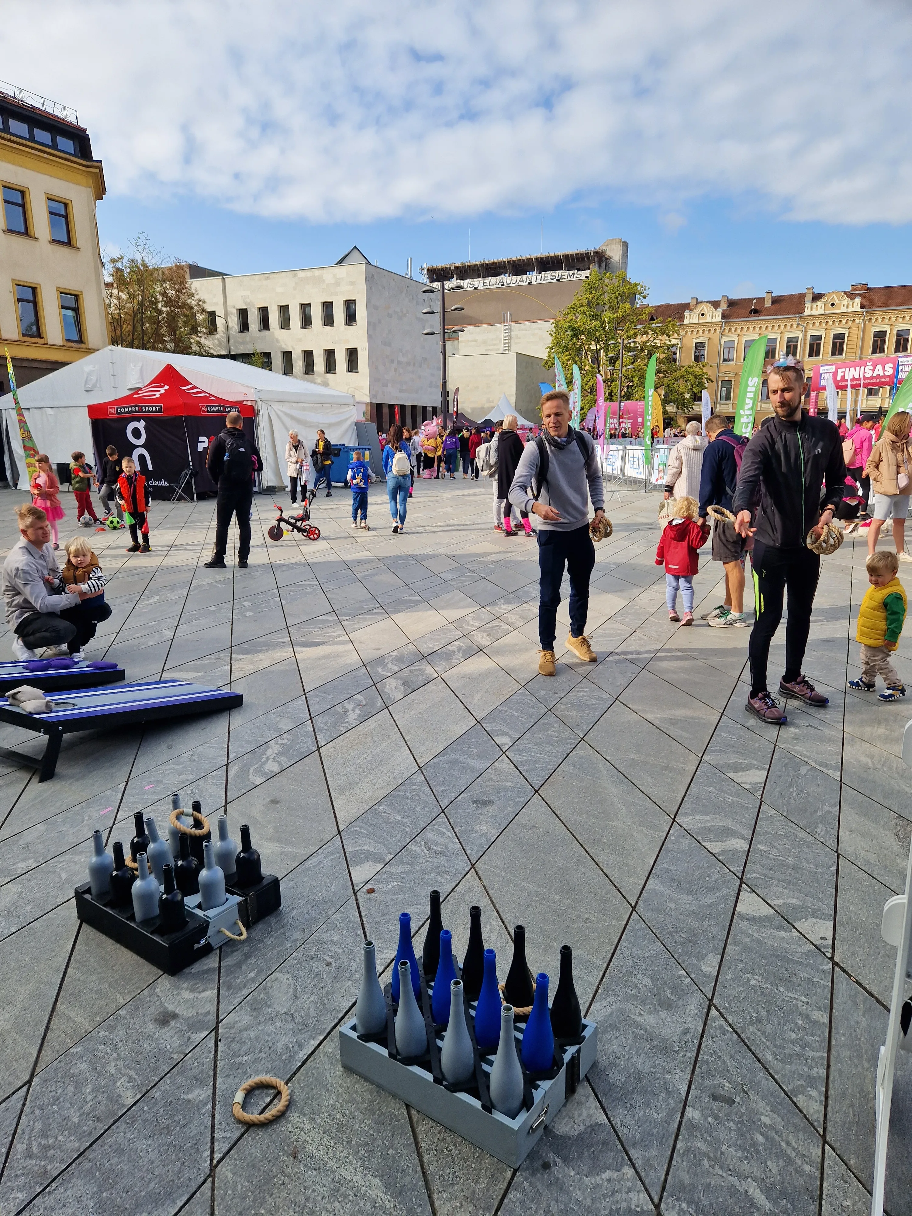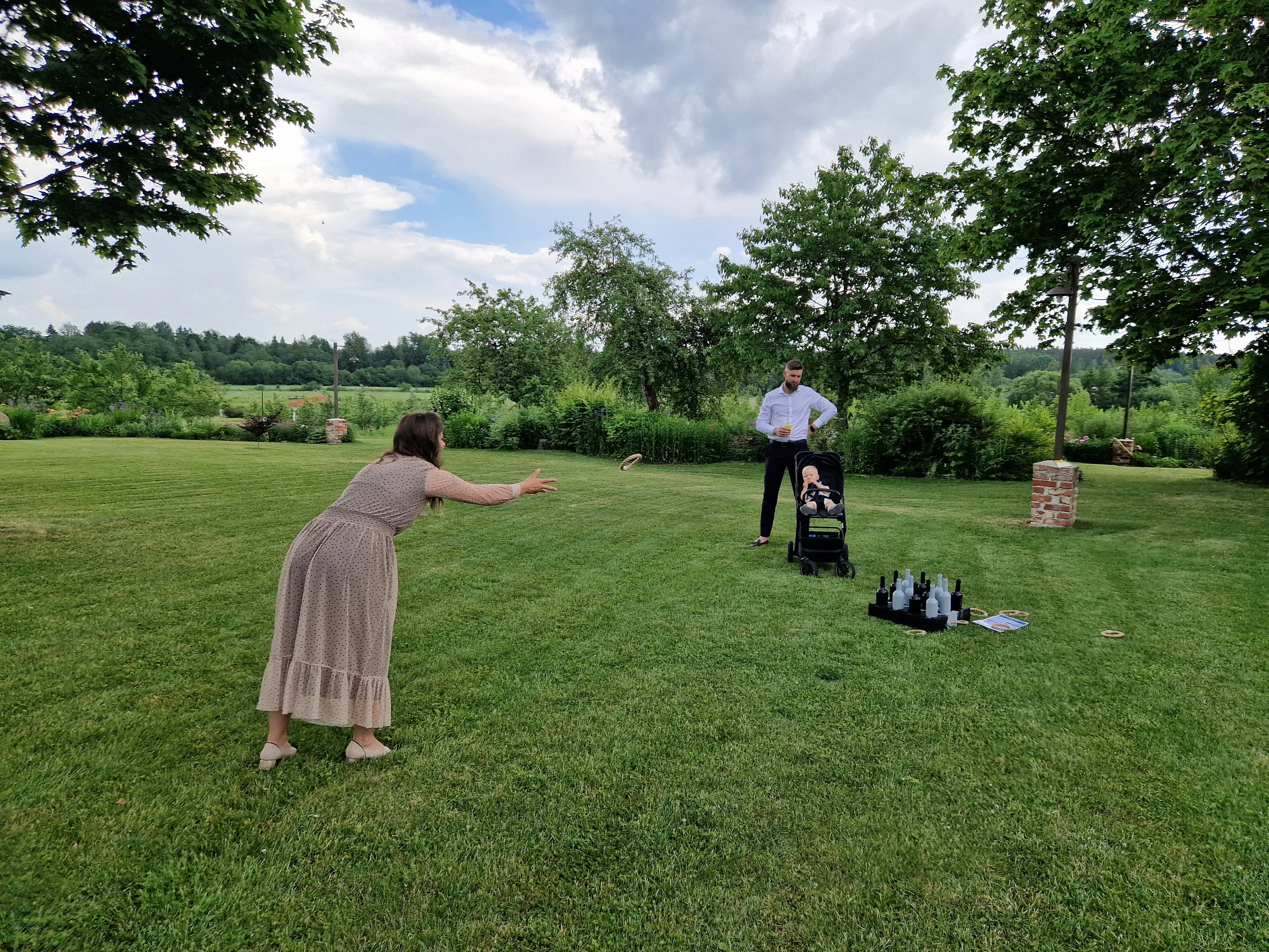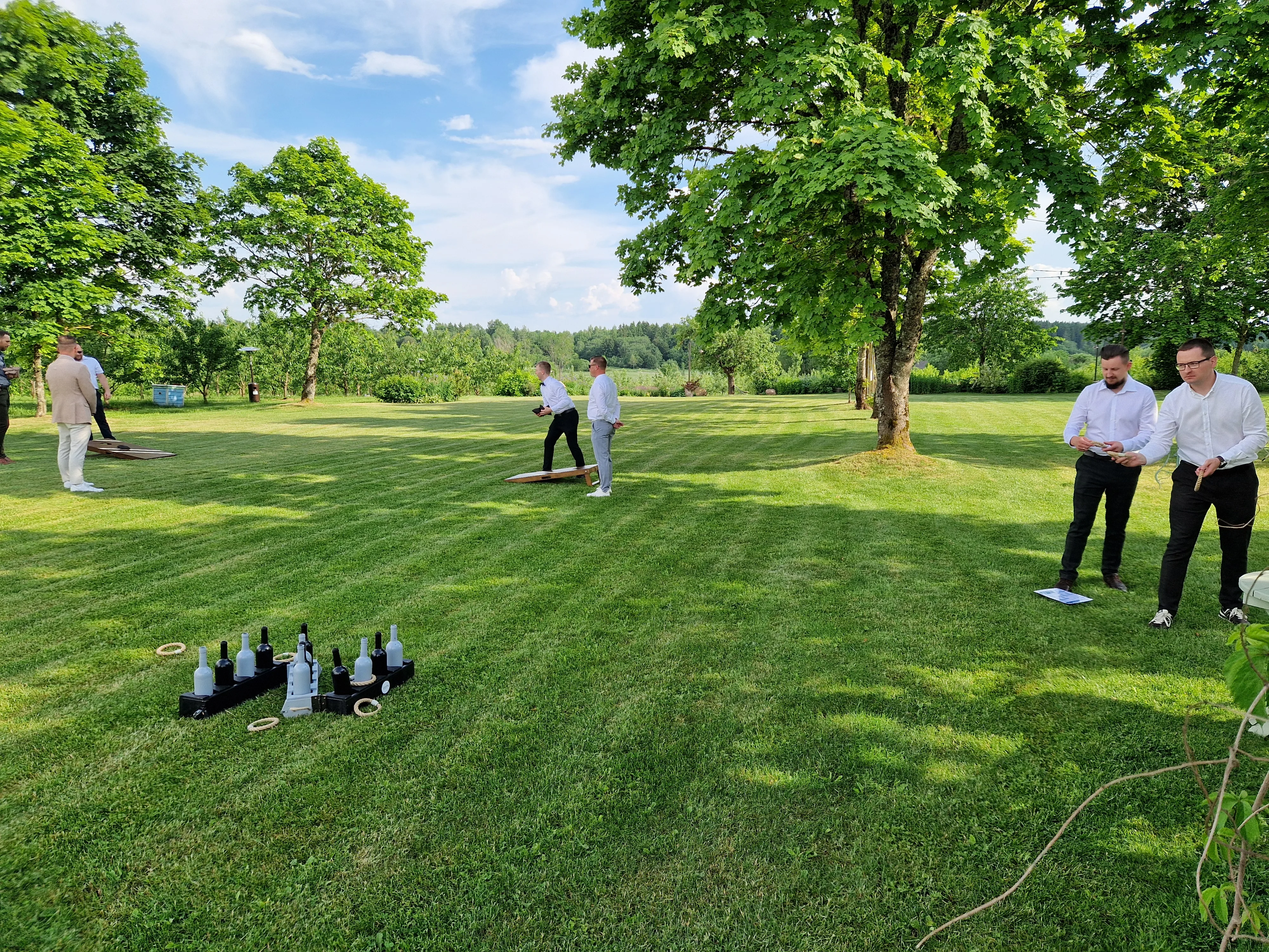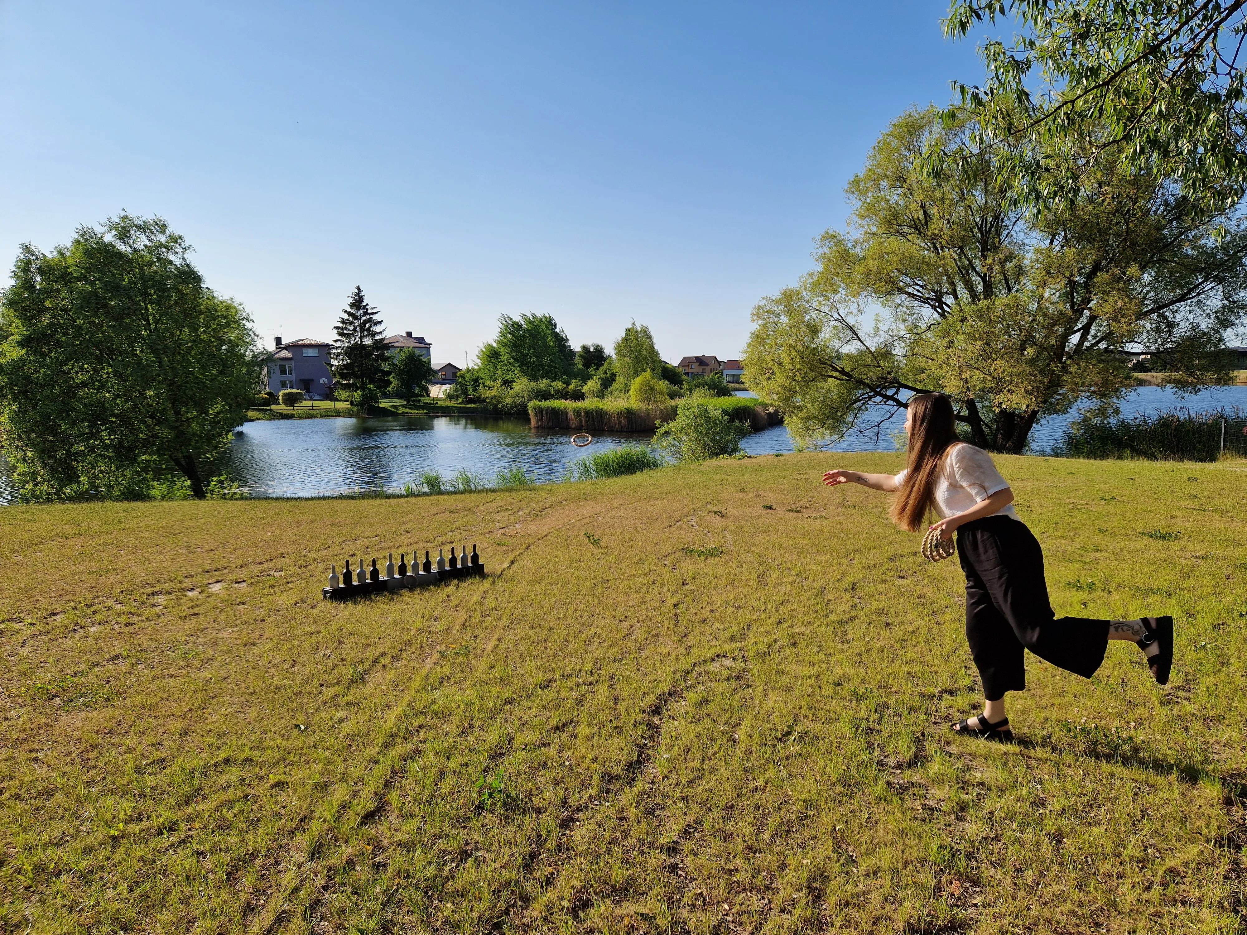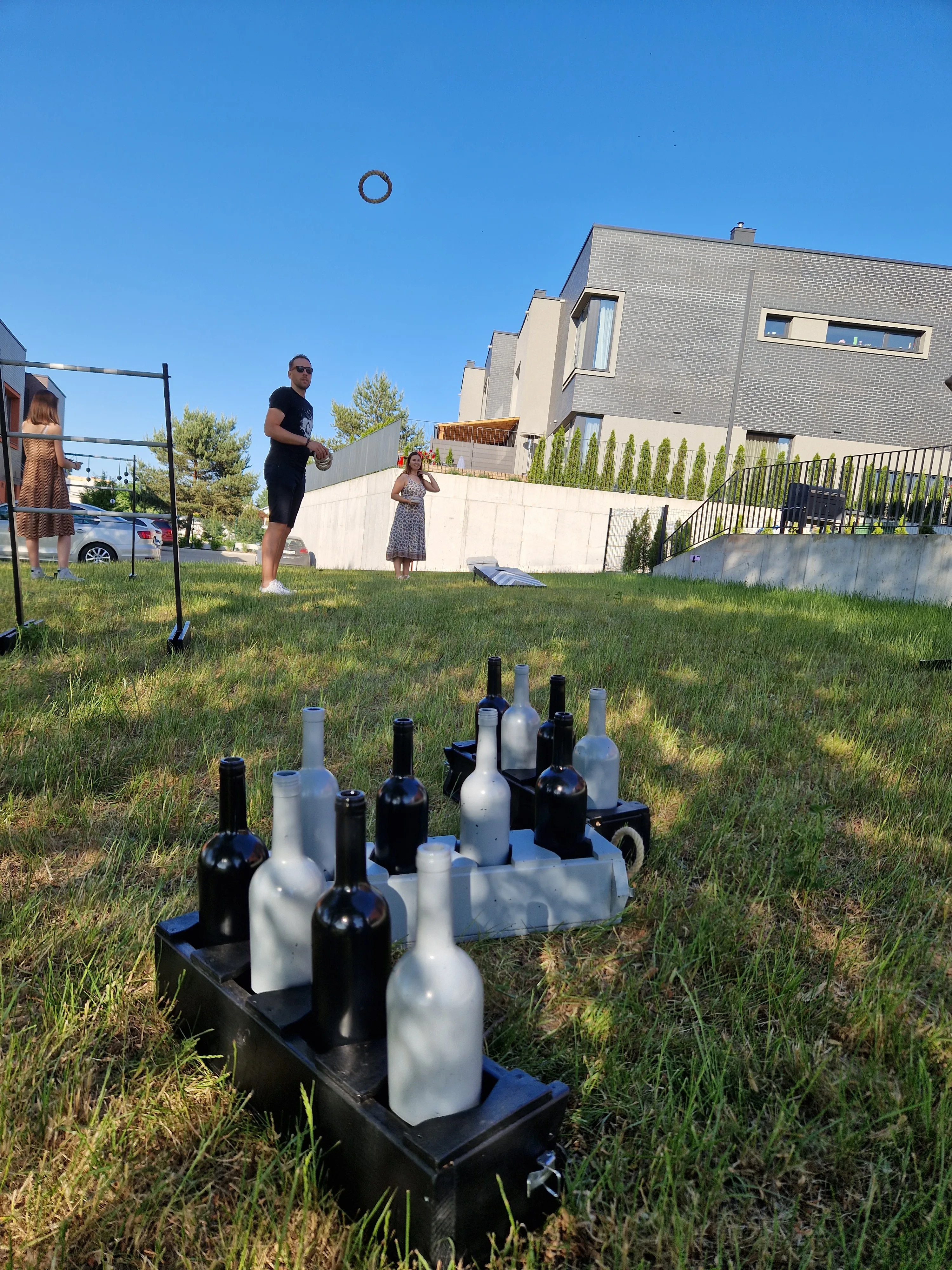 Žaidimo eiga: Kiekvienas žaidėjas iš eilės meta 8 žiedus, bandydamas juos pataikyti ant butelių kaklų.